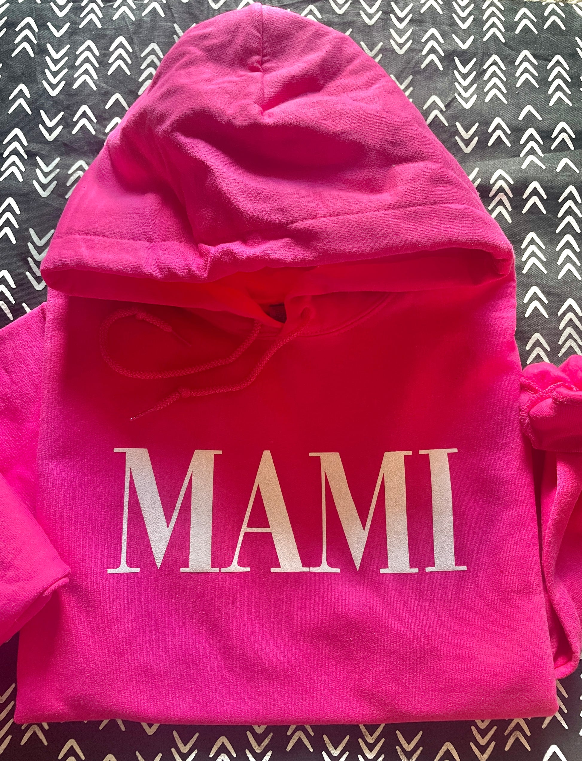 Modern script. Hot pink with white. 3D puff. Hoodie with drawstring and front pocket pouch. 50/50 cotton/polyester